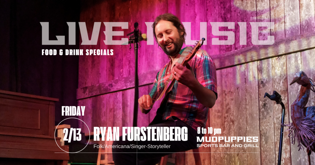Ryan Furstenberg takes the Mudpuppies stage. Let him take you away with his "rich and southern-accented baritone" and acoustic remedies.